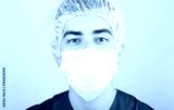 Close up of american male doctor or surgeon in protective facial mask over grey background