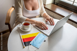Woman tourist having breakfast with cup of coffee working on laptop. Flag of Germany, medical protective face mask on table of cafe. Protection from bacteria and viruse in a public place. Concept.