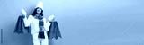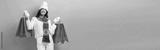 horizontal crop of joyful woman in winter outfit holding red shopping bags on blue