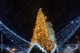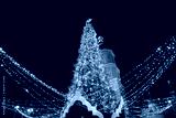 Illuminated Christmas tree in night city. Blue and yellow lights. Sophia Cathedral on background. New Year Celebration