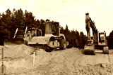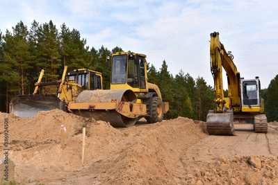 Excavator and Dozer and Vibro Roller Soil Compactor at road construction and bridge projects in forest area. Heavy machinery for road work. Building a road works. Leveling and compaction of soil