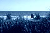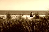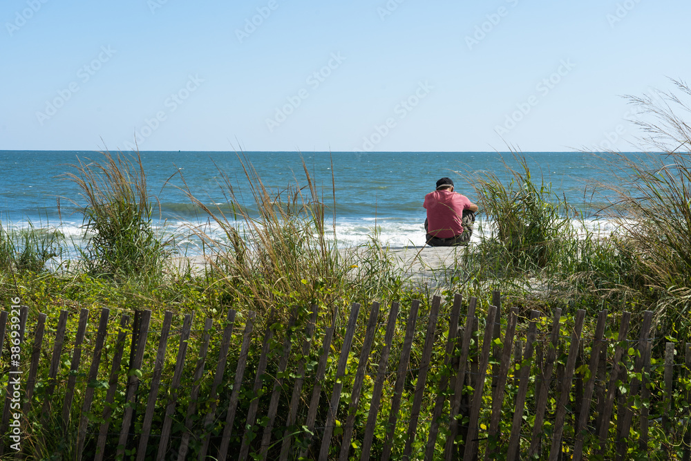 solitary male sitting alone on a beach with beach grass and storm fencing in the foreground