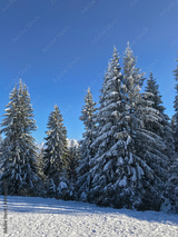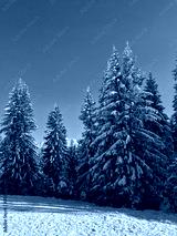 Idyllic snowy winter scene: snowcapped trees with falling snowflakes.