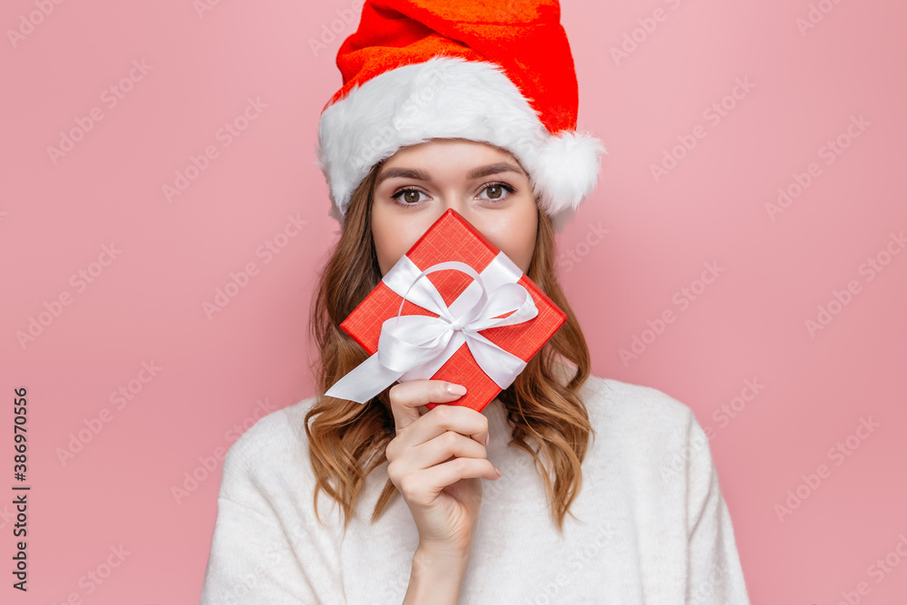 Happy New Year celebration, merry Christmas concept. Young woman covering her face with red gift box isolated on pink studio background. Girl showing a gift to the camera
