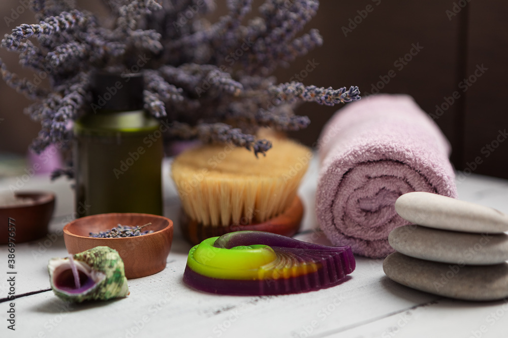 The concept of SPA. Flat layer of dry lavender flowers, essential oil, sea salt, flat stones, scented candle, pink bath towel on a wooden white background.