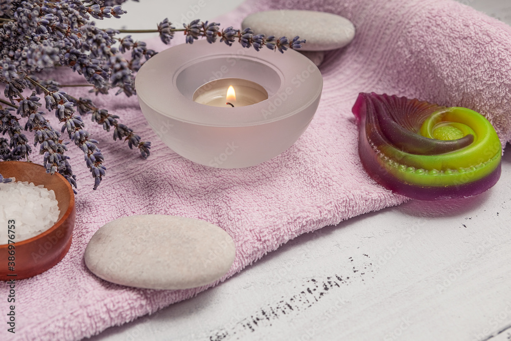 The concept of SPA. Flat layer of dry lavender flowers, essential oil, sea salt, flat stones, scented candle, pink bath towel on a wooden white background.