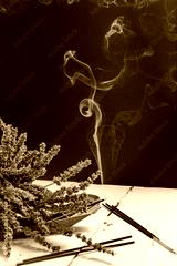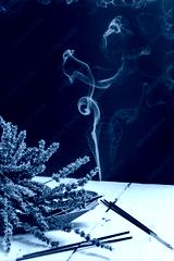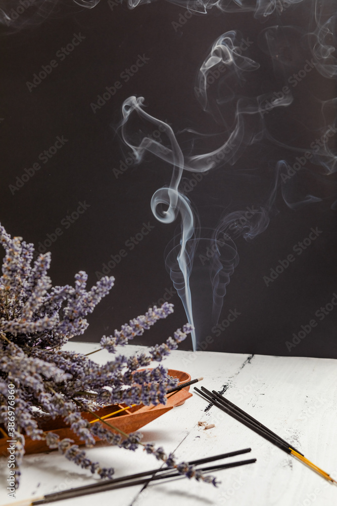 Asian incense sticks and a bouquet of dried lavender on a white wooden table against a dark wall, a wave of incense. Peaceful atmosphere.