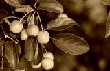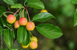 Close-up of ripe, small, red ornamental apples hanging from a branch on a tree against a green background