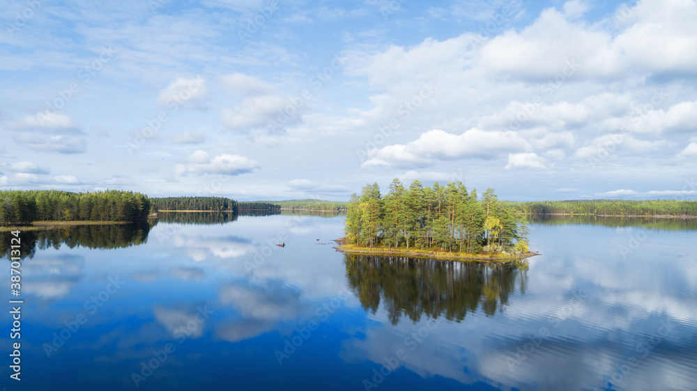 Beautiful panoramic aerial view of the lake in Finland. Vacations, eco tourism, nature of Scandinavia.