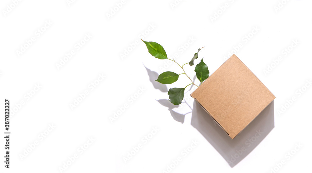 Eco friendly packaging, paper recycling, zero waste, natural products concept. A young twig with green leaves in a craft box on a white background. Isolated. Copy space. Horizontal.