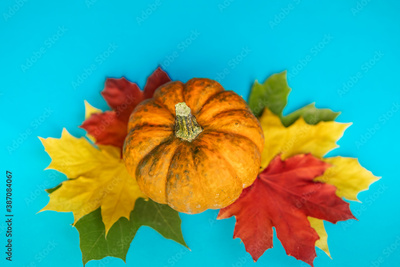 blue background with pumpkin and autumn maple leaves in green, orange and yellow with space for text.