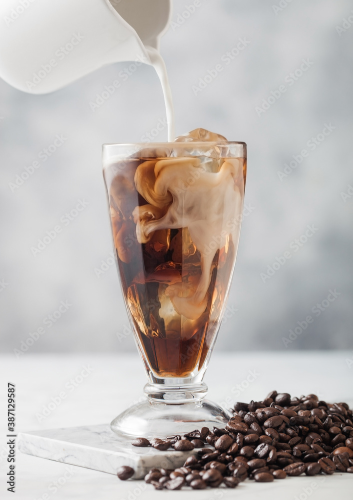 Pouring milk into milkshake classic glass with iced black coffee and fresh raw beans on light background.