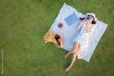 View from above of young attractive slim woman in white dress laying relaxing with laptop computer and coffee in green grass