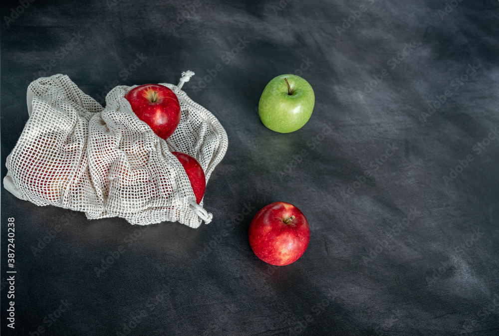 Fresh red and green apples in cotton mesh eco bag on a dark background. Sustainability and Zero waste shopping concept. Top view