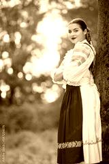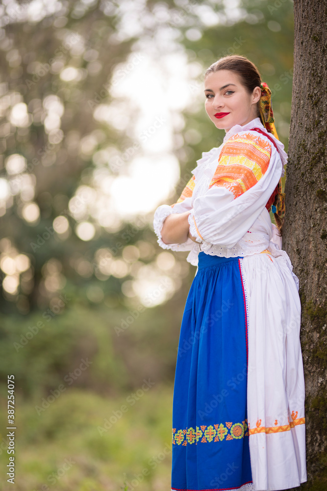 Beautiful woman wearing traditional Eastern Europe folk costumes. Slovak folklore.