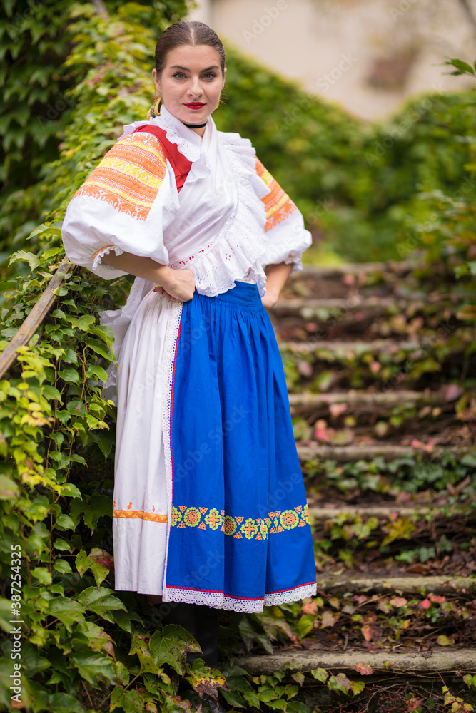 Beautiful woman wearing traditional Eastern Europe folk costumes. Slovak folklore.