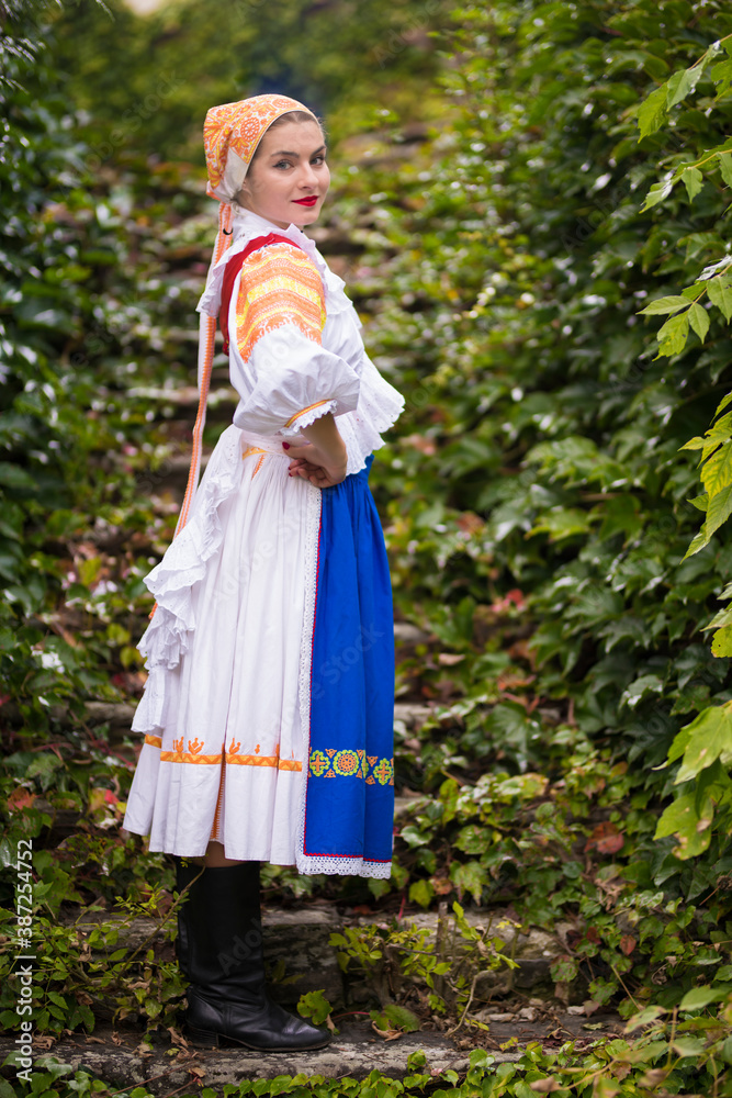 Beautiful woman wearing traditional Eastern Europe folk costumes. Slovak folklore.