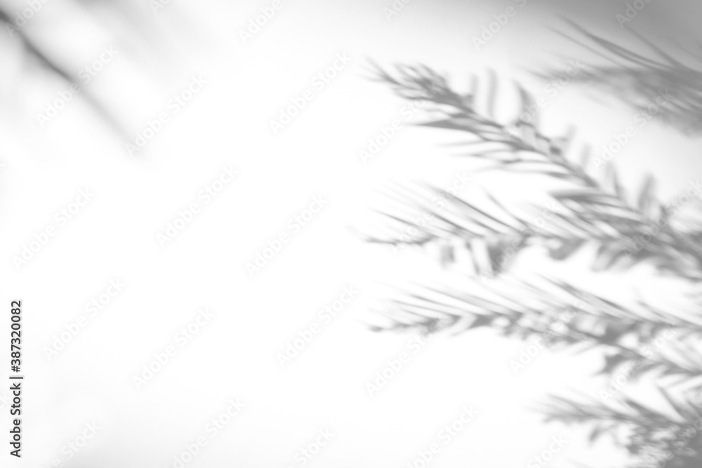 Blurred overlay effect for photo. Gray shadows of fir tree branches on a white wall. Abstract neutral nature concept background for design presentation. Shadows for natural light effects