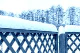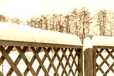 Wooden fence covered with snow in winter cloudy day after snowfall. Winter season, cold weather concept. Beautiful winter background in rustic style, copy space