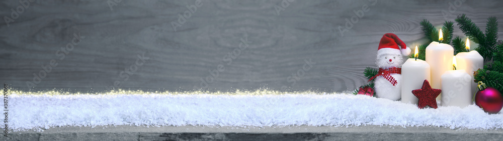 Christmas background with snowman and four advent candle isolated on gray.