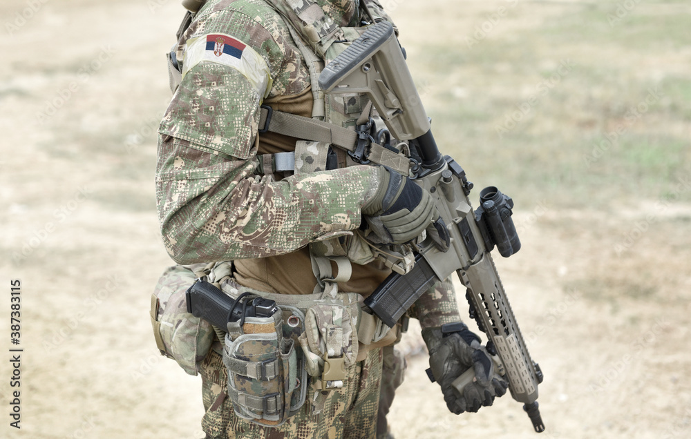 Soldier with assault rifle and flag of Serbia on military uniform. Collage.