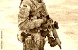 Soldier with assault rifle and flag of Ecuador on military uniform. Collage.