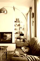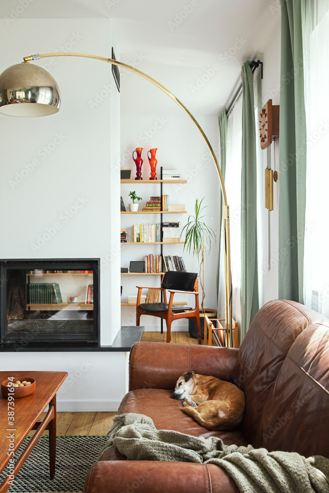 Interior design of stylish living room interior with vintage furniture, home office library, fireplace, lamp, decoration and elegant personal accessories in home decor. Template.