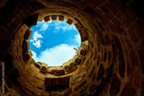 looking up to the sky or at the end of the tunnel there is a light, foreground tunnel and background the blue sky with clouds