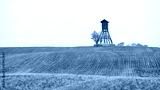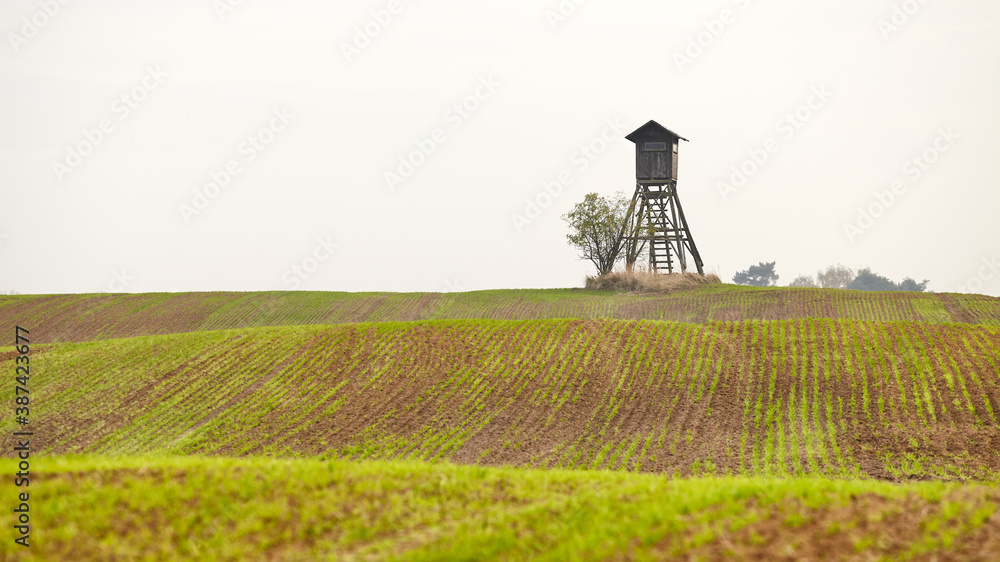 Rural landscape with wooden hunting blind on a field in an autumnal foggy morning.