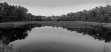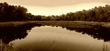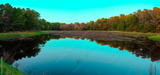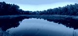 Pink twilight landscape over the cranberry bog and reflections on the blue water surface in October on Cape Cod in Massachusetts