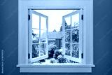Open window to the back yard with small shed.