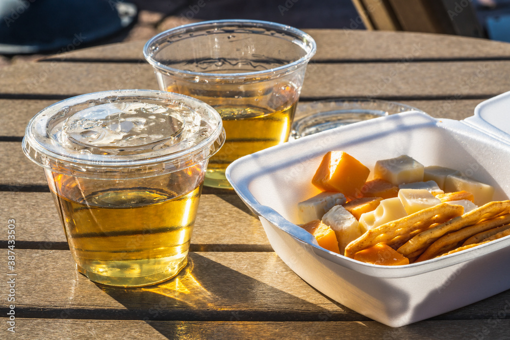 selective focus on a wine and cheese party in the time of Covid 19 with individualy packaged cheese and crackers and pre-portioned white wine in clear plastic cups outside in late afternoon sun
