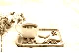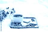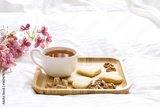 Good morning, wonderful day concept. Breakfast in bed: cup of fragrant tea with homemade delicious cookies, brown sugar on wooden tray. Pink flowers, open book a white blanket on the background.