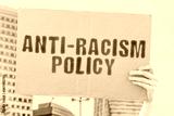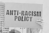 The phrase " Anti-Racism Policy " on a banner in hand. Human holds a cardboard with an inscription. Equality. Multicultural. Nationality. Law. Legislation. Human rights
