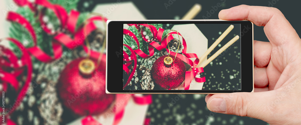 Christmas gifts in WOK paper packaging boxes on the smartphone screen. For Asian fast foods.