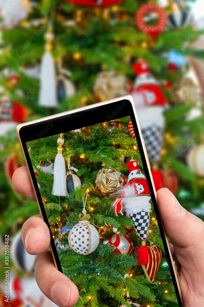 Christmas decorations on the smartphone screen. Christmas holiday.