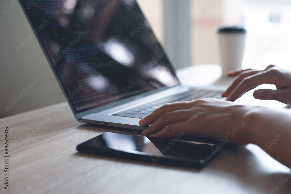 woman working on laptop computer and coding computer scripted for digital software development concept