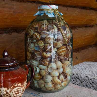 In a glass jar are different shells from the sea, the ocean. Bank against the backdrop of wall made of wooden logs.
