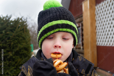 A European boy in a warm jacket and hat stands in winter near a fir tree. The child holds the steering wheel in his mouth. On the neck of the baby garland with bagels. The Celebration Of Carnival.