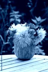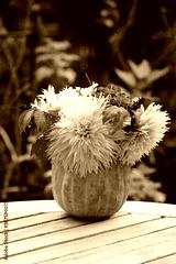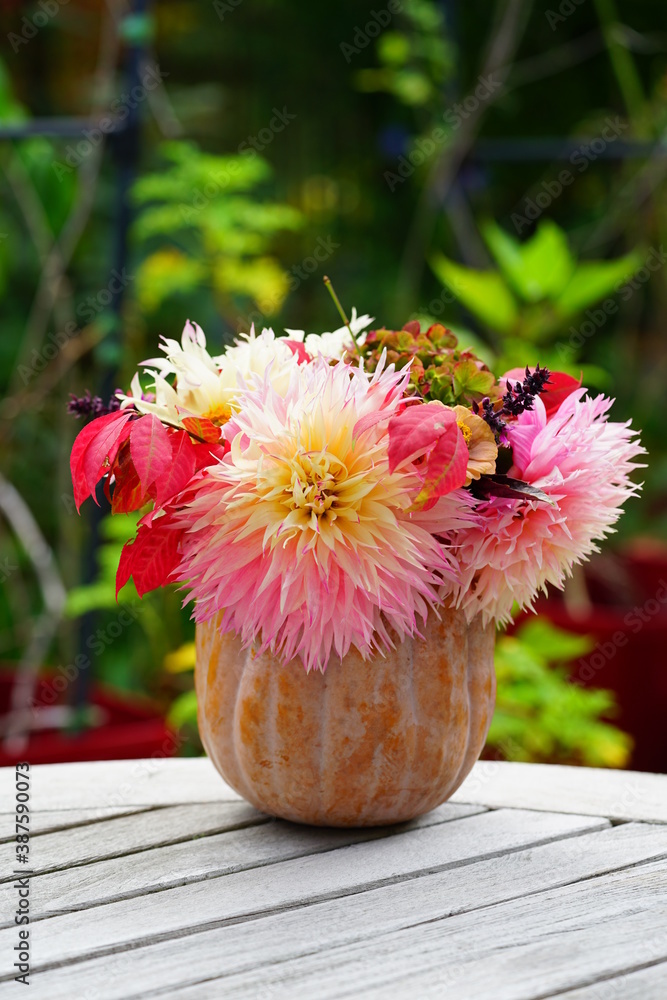 Fall floral arrangement with dahlia, hydrangea and burning bush in a pumpkin
