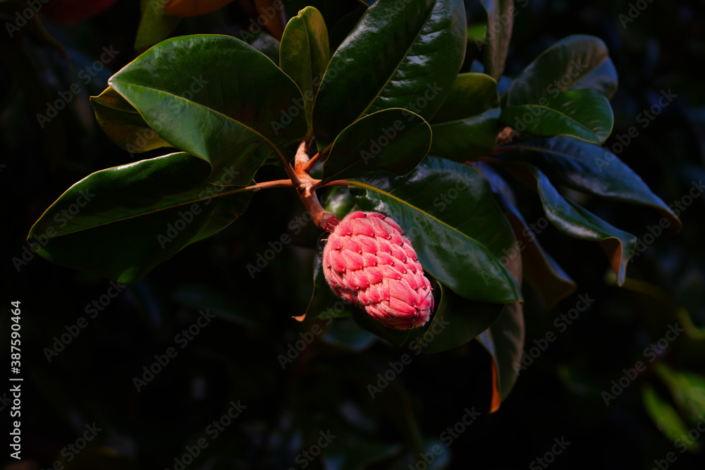 Red fruit of a Southern Magnolia tree
