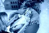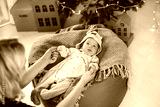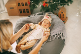 A beautiful baby in a deer costume lies on a knitted blanket and holds his mother's hands. Child and mother on the background of a decorated Christmas tree. New year holiday. Christmas and New year