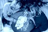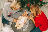A cheerful baby lies next to the Christmas tree and smiles at his mother and sister. A mother and a girl play with a baby in a room decorated for Christmas. Holiday, New year, Christmas