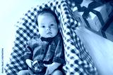 A small child is lying on a bright plaid blanket next to a Christmas tree. The kid is happy with the holiday. Festive event. Christmas and New year concept