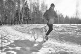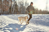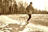 Labrador retriever dog with its owner man in the winter outdoors doing jogging sport