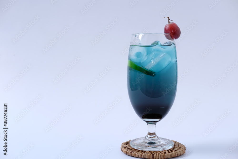 glass of water with ice on blue