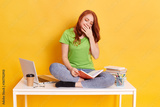 Adorable red haired tired sleepy woman sitting on her desk with books and computer, keeps eyes closed, covering her mouth while yawning, spending long hours studying against yellow wall.