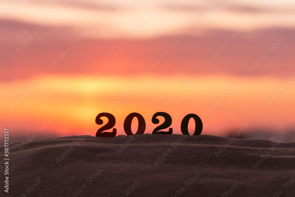 Silhouette of 2020 wooden numbers on the sand on the beach at sunset. Setting sun. The symbol of the outgoing year. 2021