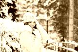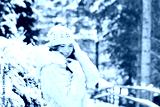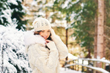 Seasonal winter portrait of middle age woman enjoying nice sunny day in forest, wearing white cozy knitted hat and jacket