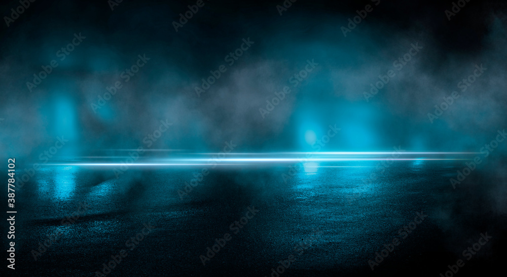 Light effect, blurred background. Wet asphalt, night view of the city, neon reflections on the concrete floor. Night empty stage, studio. Dark abstract background, dark empty street. Night city.